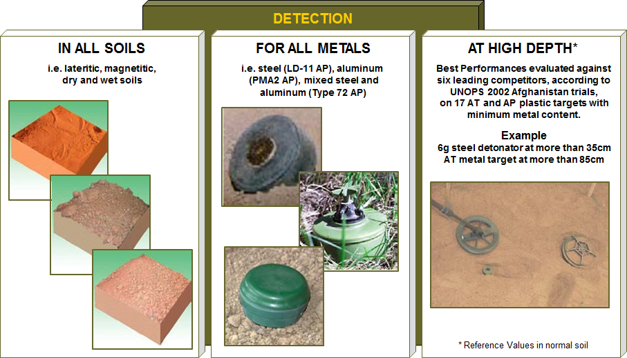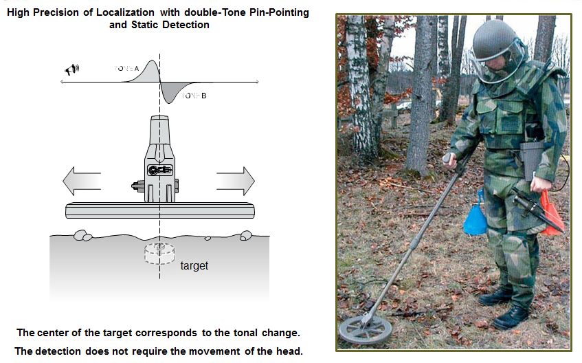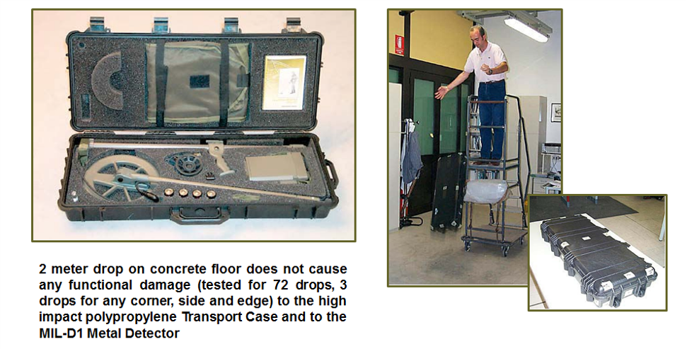 MIL-D1 é um Detector de Metais portátil, de grande sensibilidade, projectado para a detecção de metais, magnéticos e não magnéticos, em terrenos conductivos e não conductivos. O Detector de Metais compõe-se de uma cabeça de exploração, um mastro telescópico, uma central eletrónica, uma carteira de teia para o transporte e uma mala em polipropileno antichoque.